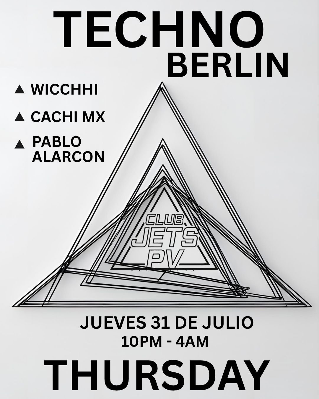 BERLIN TECHNO llega a Club Jets PV con un full rave experience: hypnotic visuals, dark room vibes y un sonido que te va a volar la cabeza.